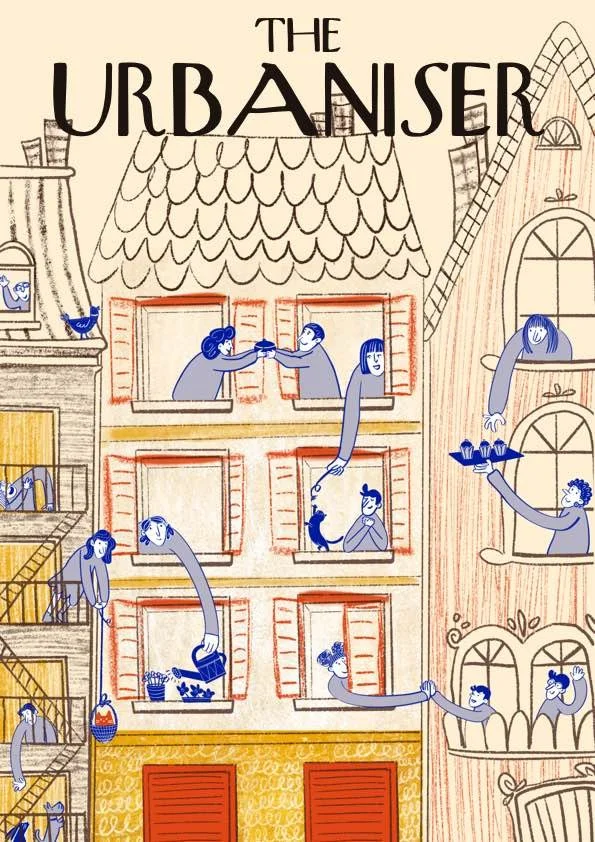 With this piece, I wanted to transform everyday urban density into a joyful celebration of community and playful human connection. I kept things light and fun with a limited palette of warm primary colours and loose, messy lines to give it a traditional yet playful feel. The exaggerated long arms stretching between the characters were my favourite detail — they really show how we reach out and link up with one another.